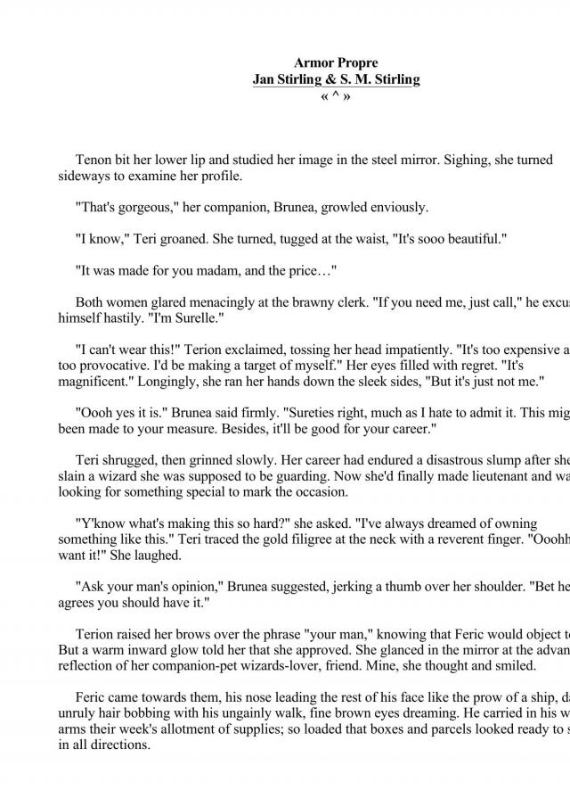 "Love," she said and threw a muscular arm around his slim shoulders, "in this business, more than in any other, timidity doesn't pay. I think that what I stand to gain more than outweighs the added risk." She smiled at his worried expression. "Trust me, Feric, I'll profit from this." She looked at herself once more and frowned. "The rest of my kit won't match," she said unhappily. "At the very least I should have black trousers."